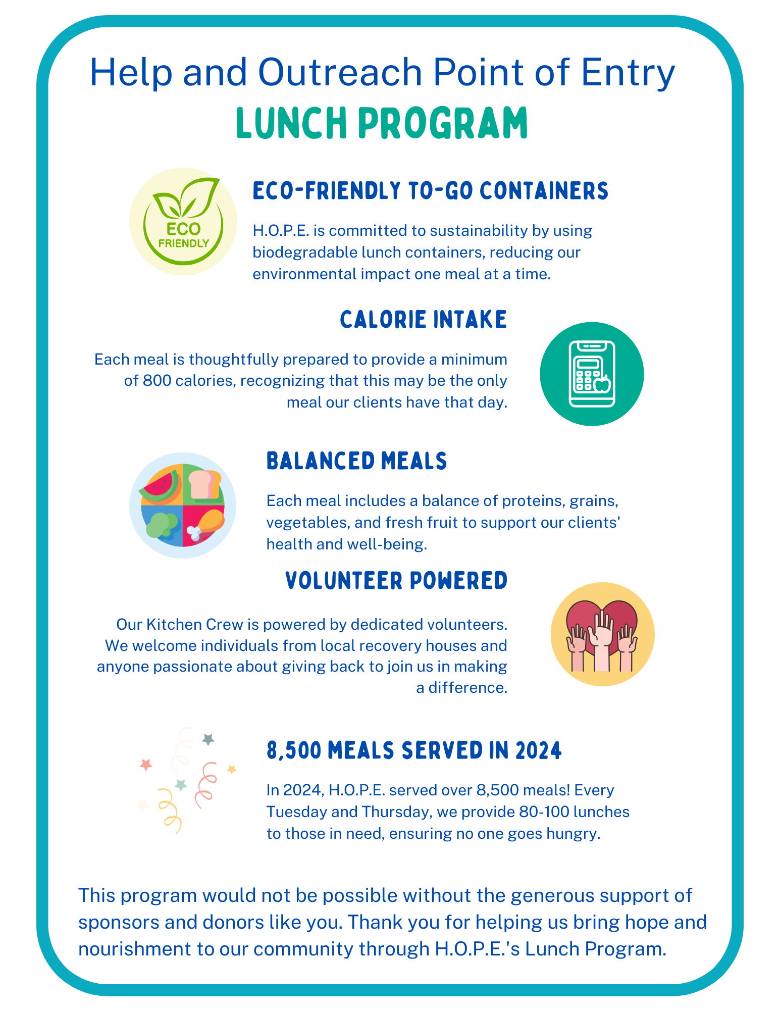 At Help and Outreach Point of Entry (HOPE), we believe that access to a nutritious meal is a basic human need and a vital first step toward stability. Our Lunch Program provides free, freshly prepared meals to individuals experiencing homelessness, housing insecurity, or financial hardship in our community.